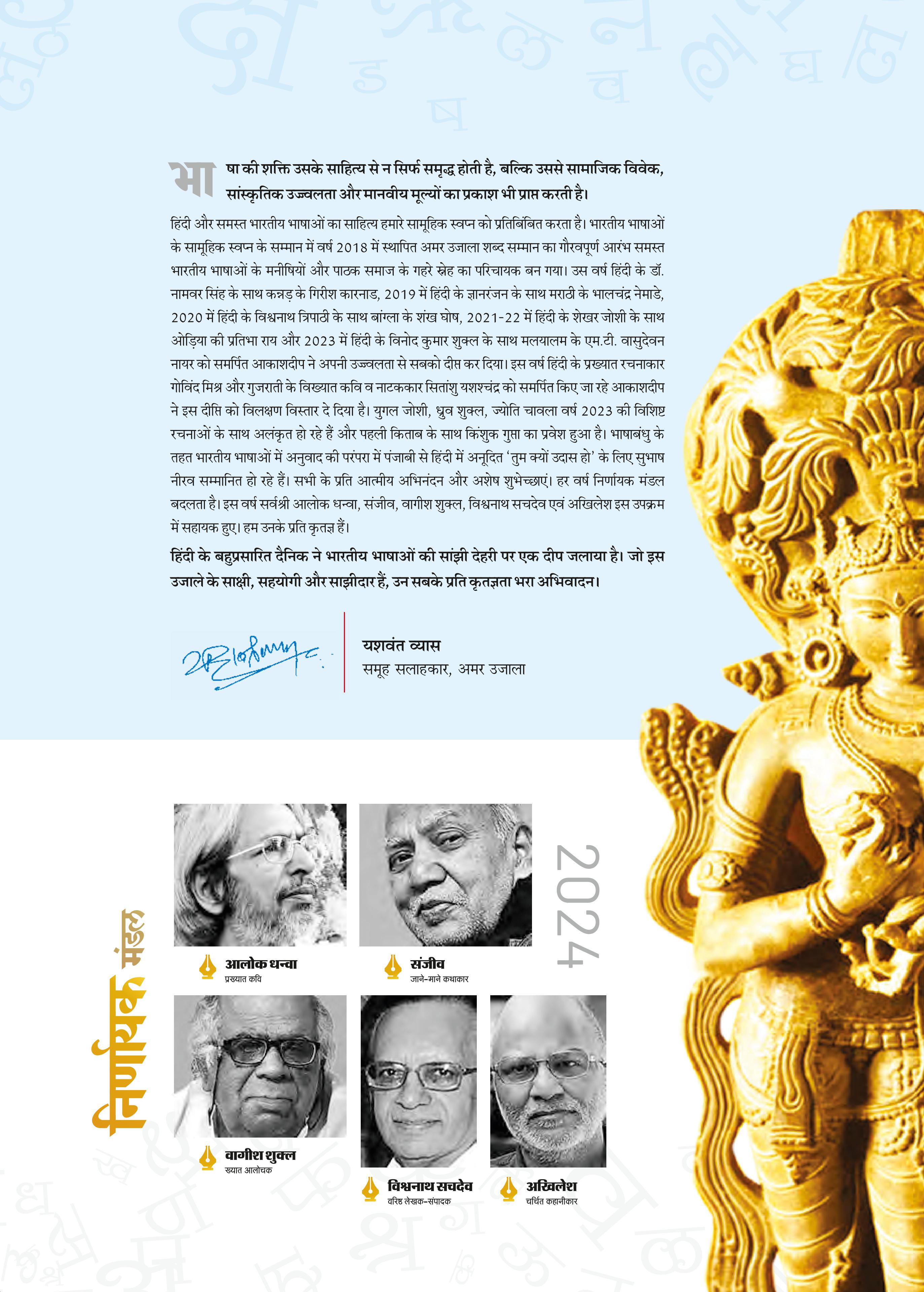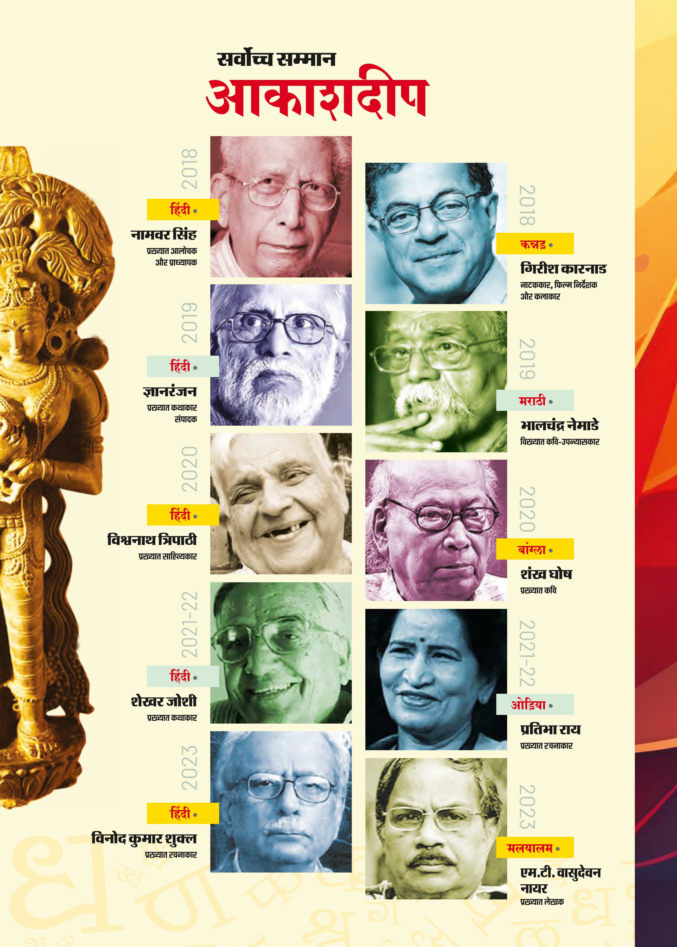 इस क्रम में अब तक हिंदी के लिए नामवर सिंह, ज्ञानरंजन, विश्वनाथ त्रिपाठी, शेखर जोशी तथा विनोद कुमार शुक्ल को और हिंदीतर भाषाओं के लिए गिरीश कारनाड (कन्नड़), भालचंद्र नेमाड़े (मराठी), शंख घोष (बांग्ला), प्रतिभा राय (उड़िया) तथा एमटी वासुदेवन नायर (मलयालम) को सर्वोच्च सम्मान दिया जा चुका है। ‘आकाशदीप’ अलंकरण में पांच-पांच लाख रुपये की राशि, प्रशस्ति पत्र और प्रतीक के रूप में गंगा प्रतिमा सम्मिलित हैं। अमर उजाला शब्द सम्मान शीघ्र ही एक समारोह में अर्पित किए जाएंगे।