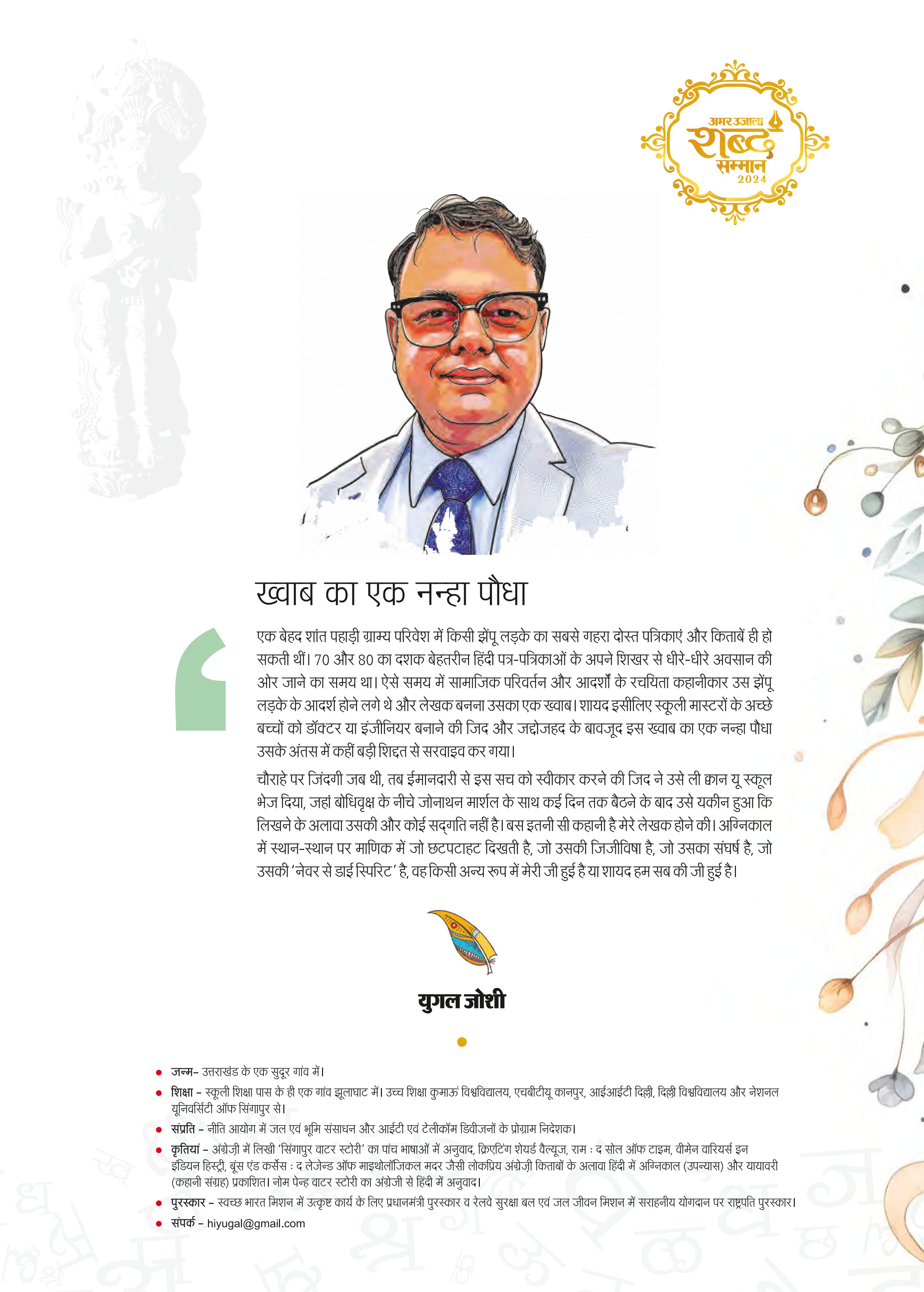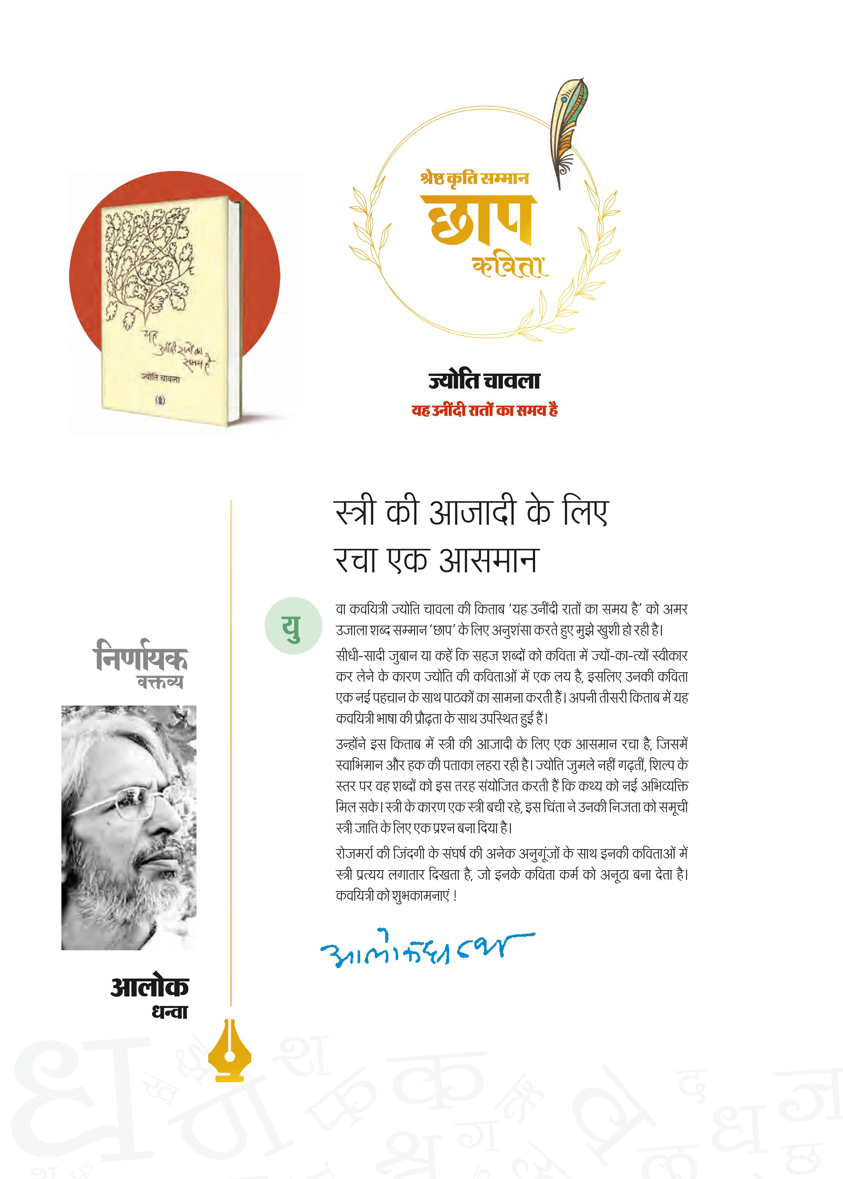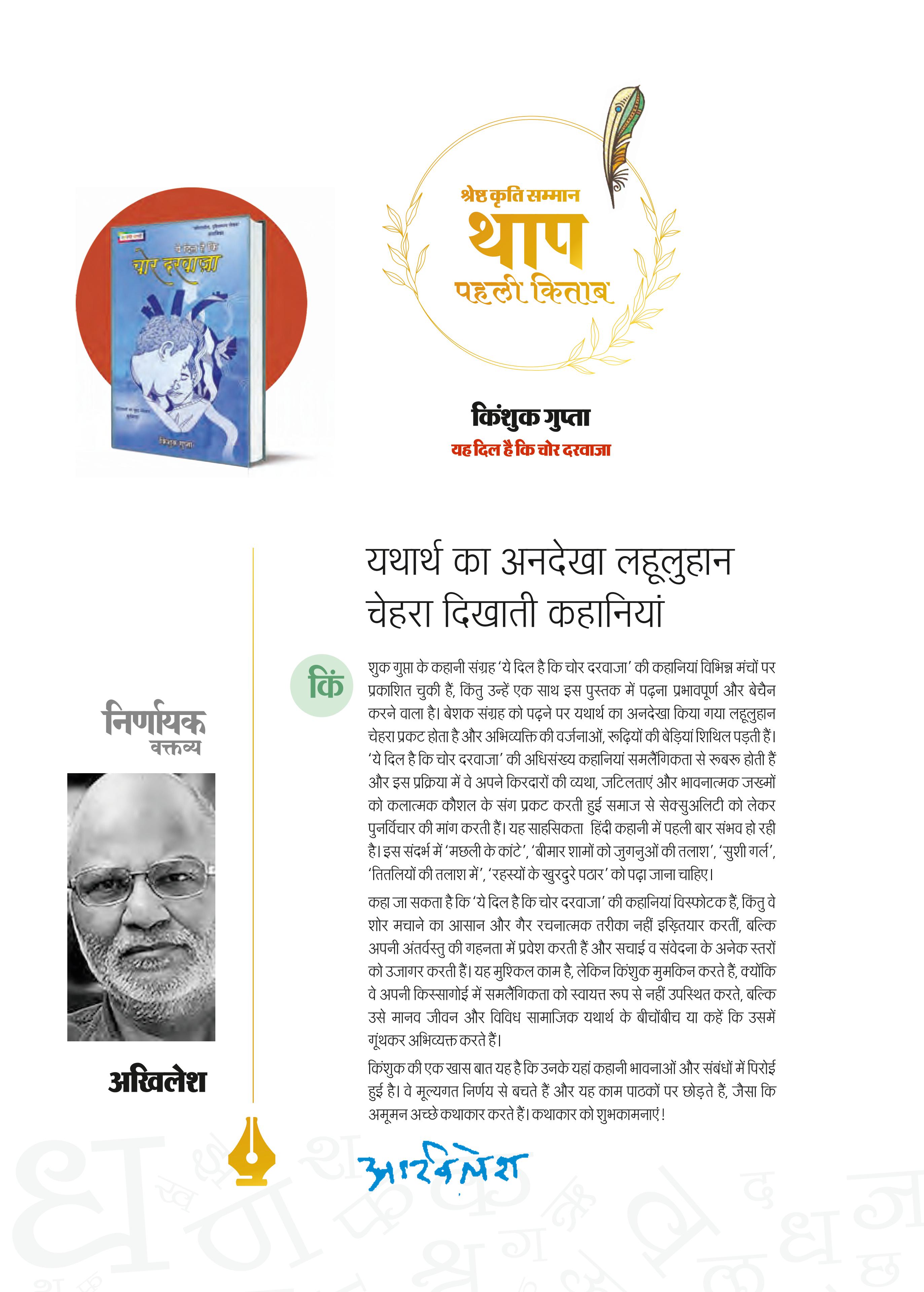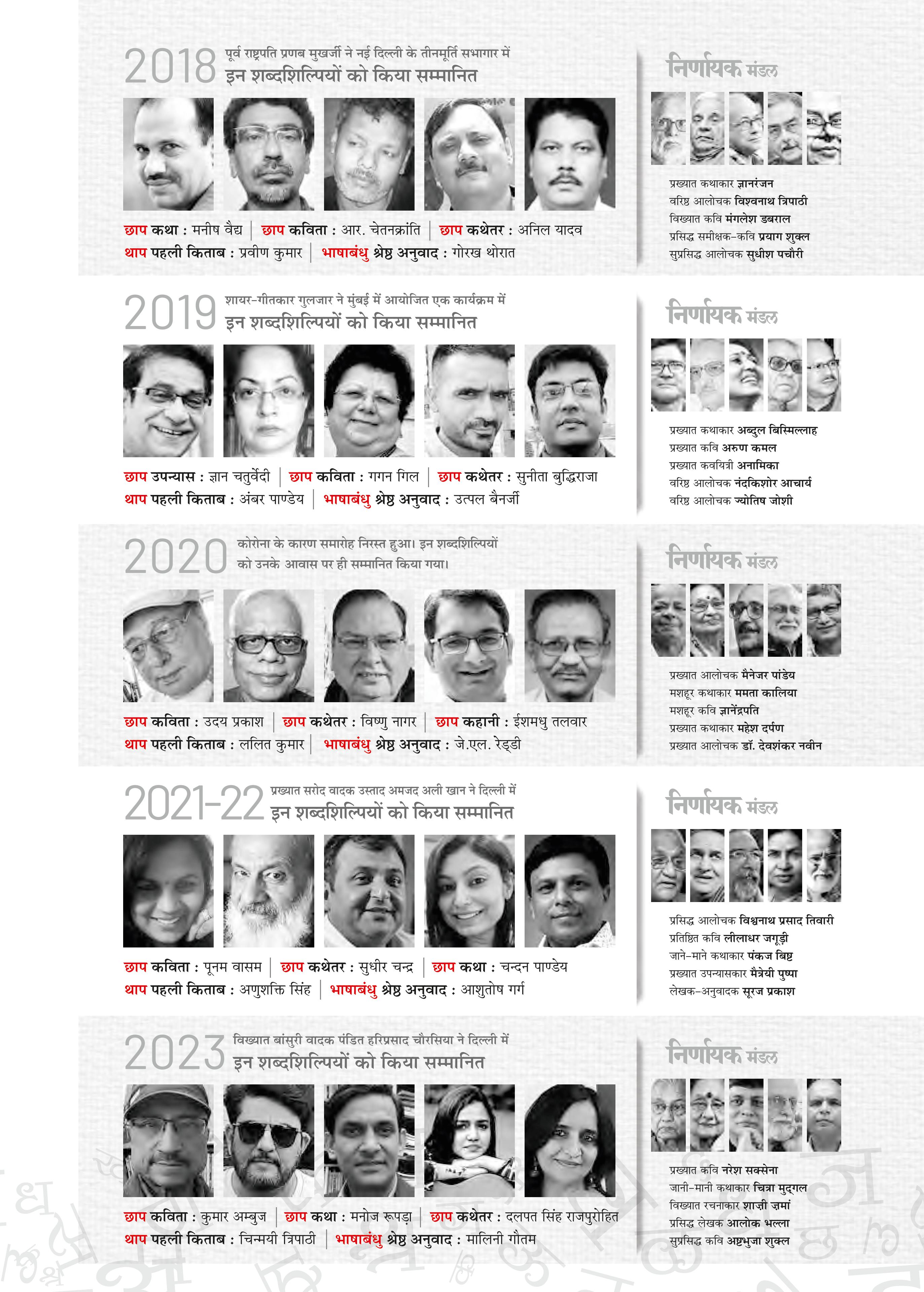 छाप : कथा वर्ग में युगल जोशी के उपन्यास ‘अग्निकाल’, कथेतर वर्ग में ध्रुव शुक्ल की कृति ‘वा घर सबसे न्यारा’ तथा कविता वर्ग में ज्योति चावला के संग्रह ‘यह उनींदी रातों का समय है’ थाप (पहली किताब): किंशुक गुप्ता की कृति ‘यह दिल है कि चोर दरवाजा’ भाषा-बंधु (भारतीय भाषाओं में अनुवाद) : ‘तुम क्यों उदास हो’ (पंजाबी मूल: कुलबीर बड़ेसरों) के हिंदी अनुवाद के लिए सुभाष नीरव को मिलेगा सम्मान।