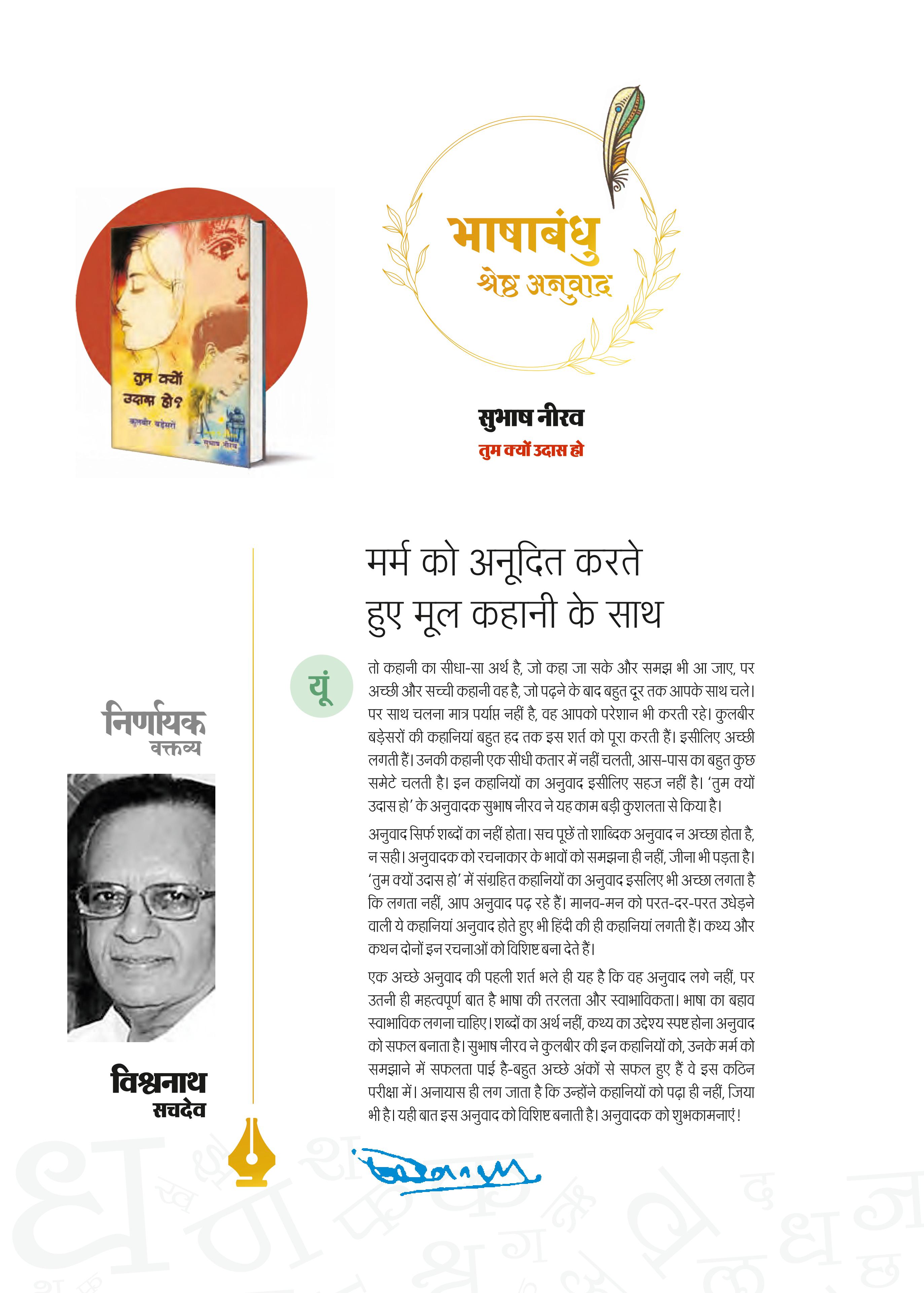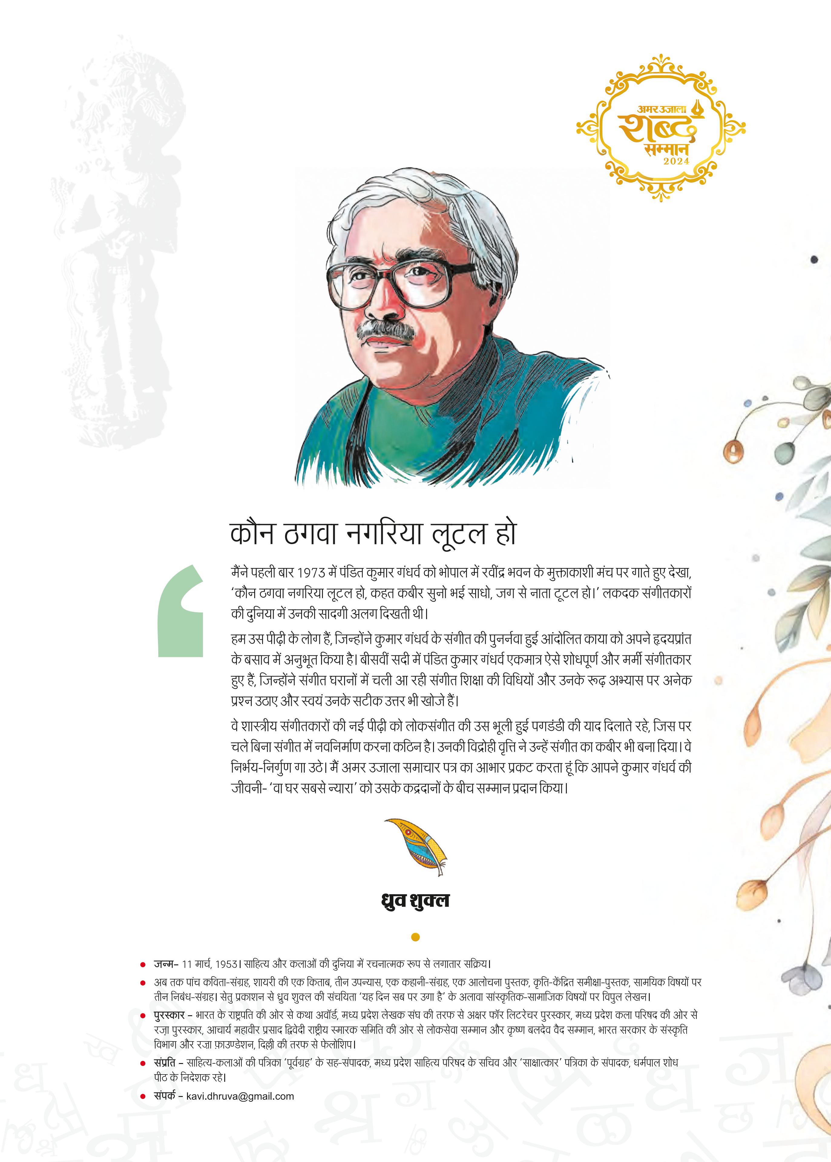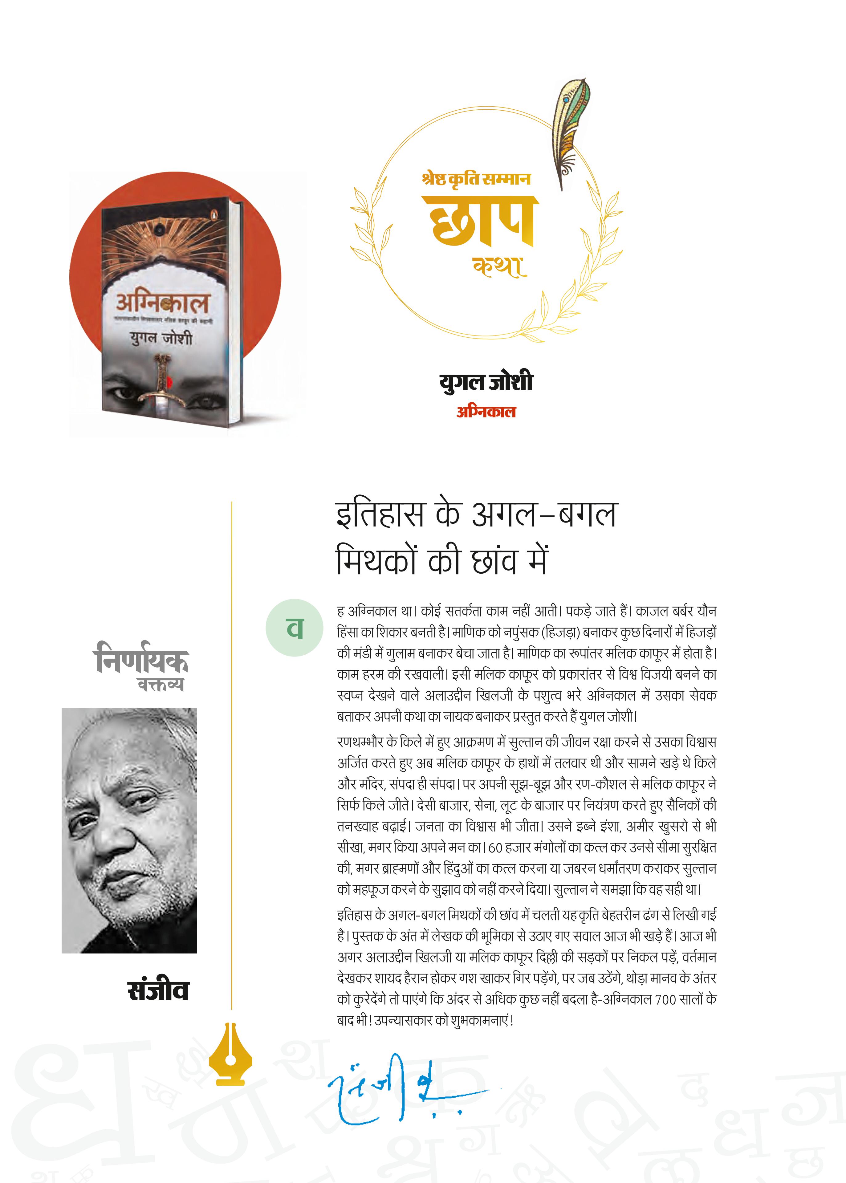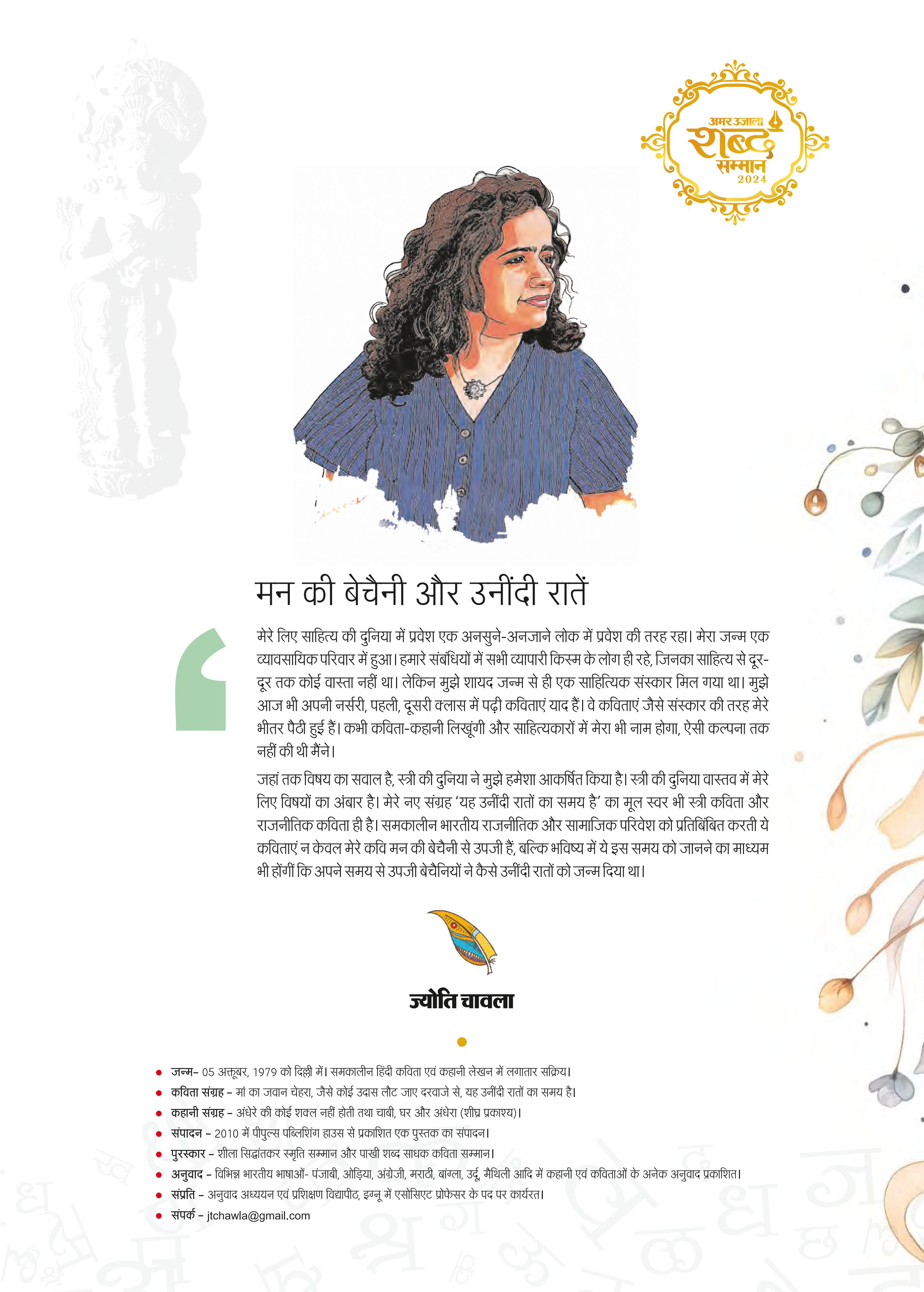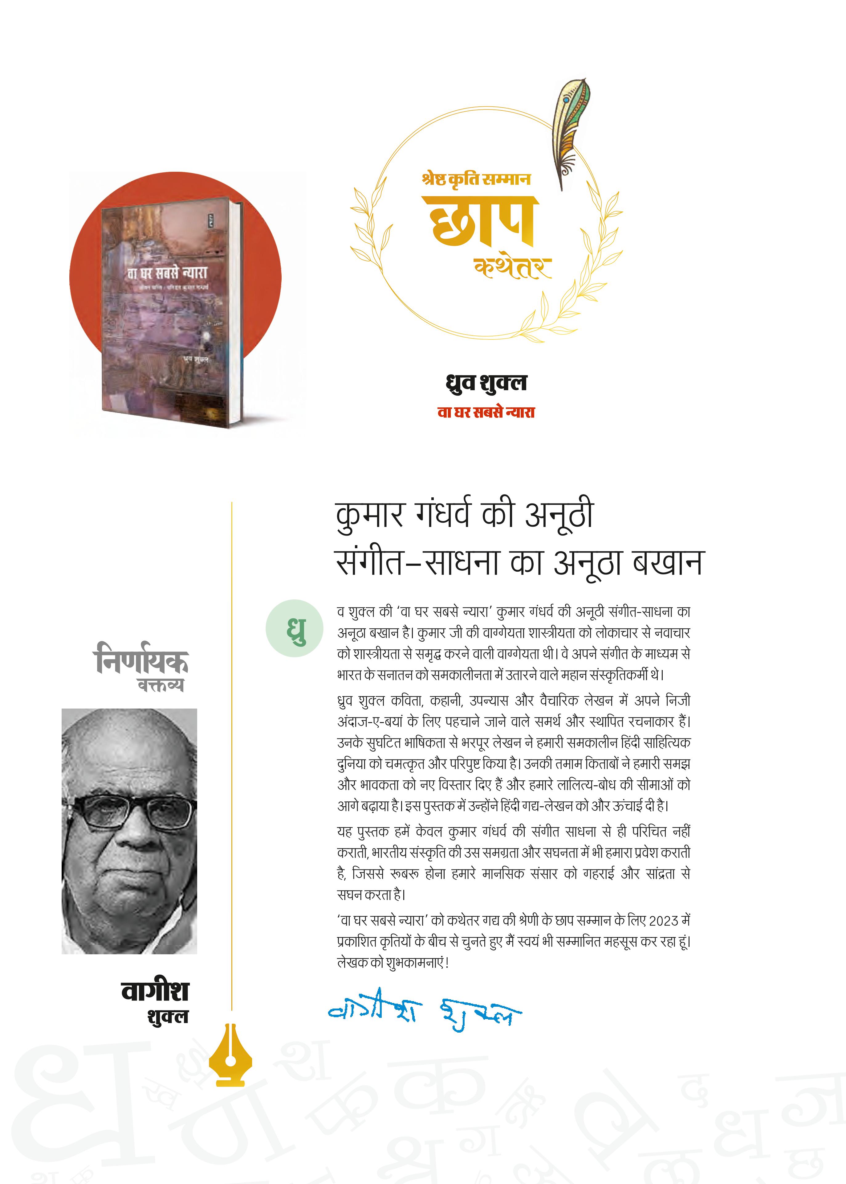 छाप : कथा वर्ग में युगल जोशी के उपन्यास ‘अग्निकाल’, कथेतर वर्ग में ध्रुव शुक्ल की कृति ‘वा घर सबसे न्यारा’ तथा कविता वर्ग में ज्योति चावला के संग्रह ‘यह उनींदी रातों का समय है’ थाप (पहली किताब): किंशुक गुप्ता की कृति ‘यह दिल है कि चोर दरवाजा’ भाषा-बंधु (भारतीय भाषाओं में अनुवाद) : ‘तुम क्यों उदास हो’ (पंजाबी मूल: कुलबीर बड़ेसरों) के हिंदी अनुवाद के लिए सुभाष नीरव को मिलेगा सम्मान।