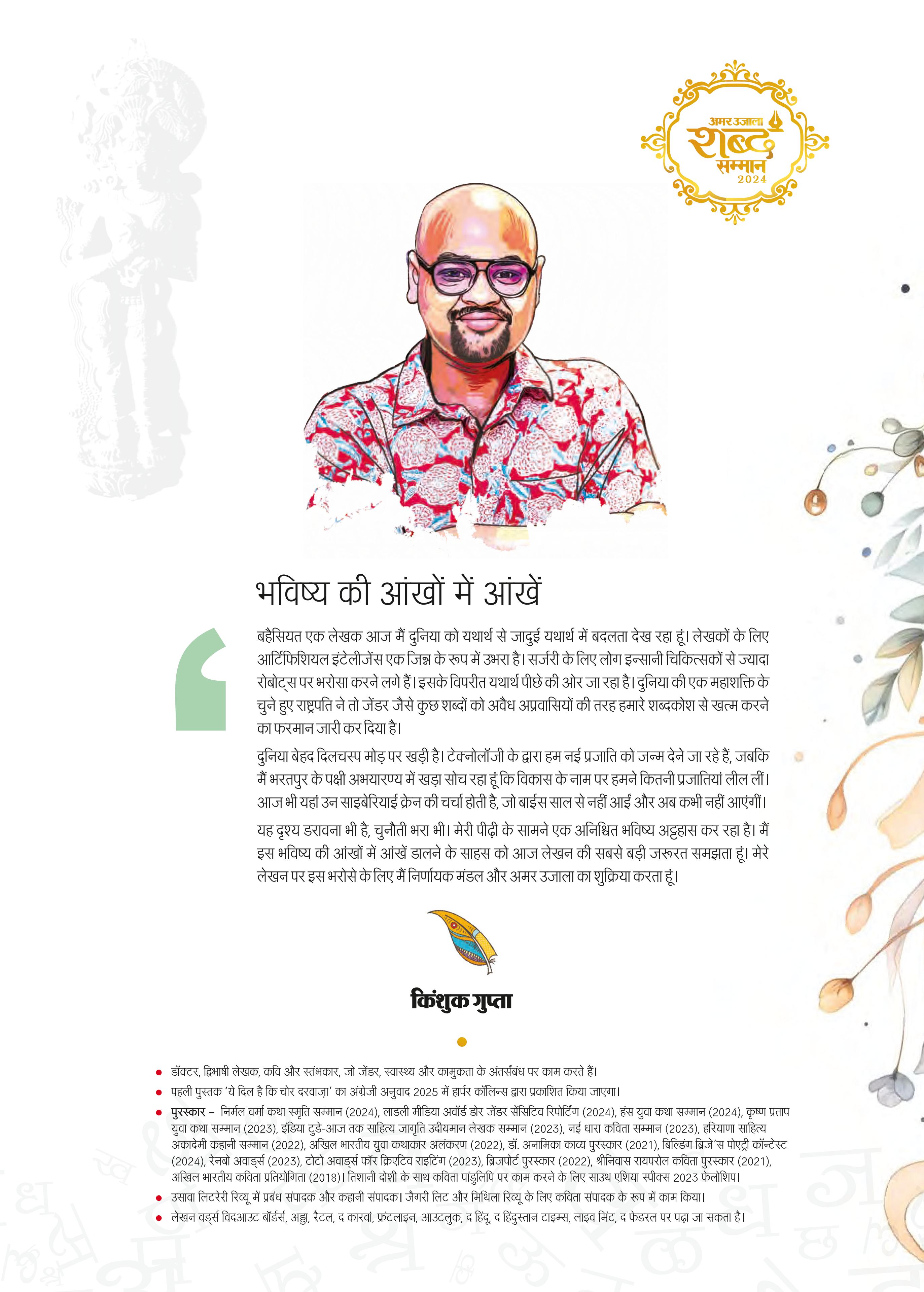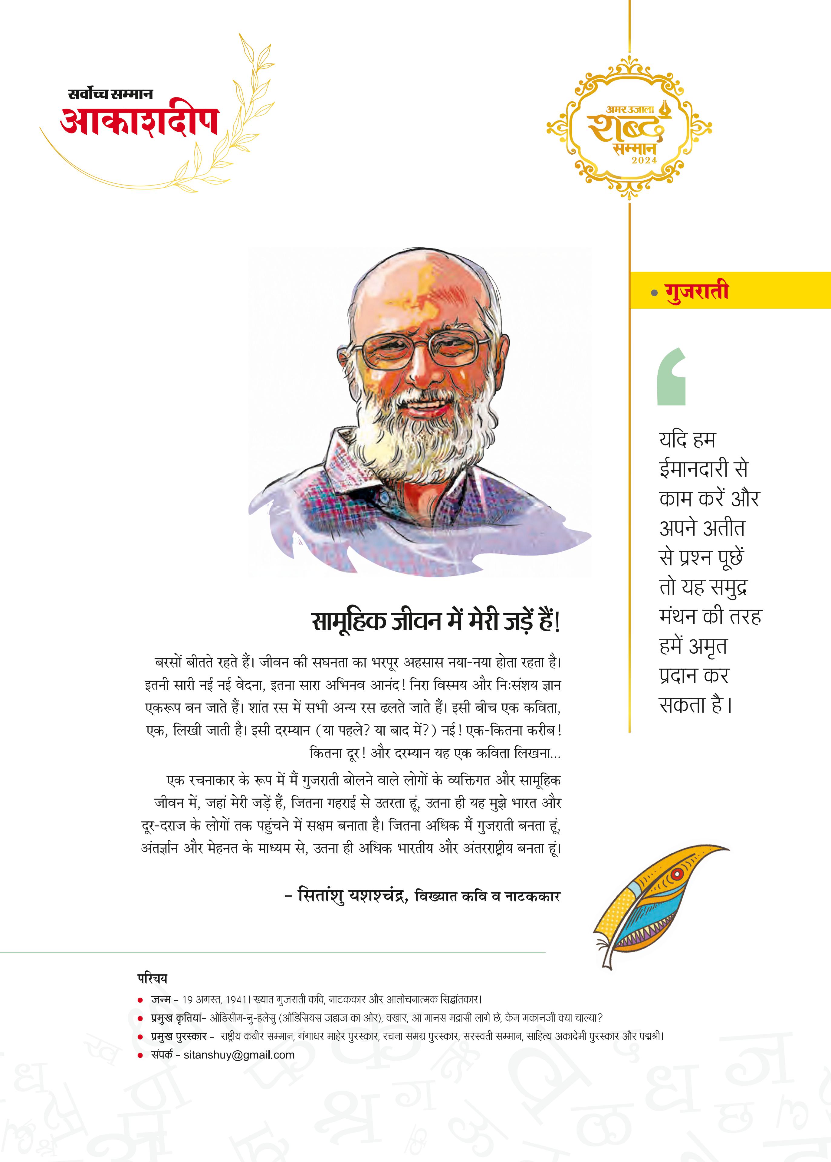 लेखन और जीवन के समग्र अवदान के लिए इस वर्ष अमर उजाला का सर्वोच्च शब्द सम्मान ‘आकाशदीप’-हिंदी में प्रख्यात कवि व लेखक गोविंद मिश्र और हिंदीतर भाषाओं में गुजराती के विख्यात कवि, नाटककार और समालोचक सितांशु यशश्चंद्र को दिया जाएगा। 19 अगस्त, 1941 को कच्छ, गुजरात में जन्मे सितांशु यशश्चंद्र को गुजराती भाषा के आधुनिक कला-साहित्य में अप्रतिम योगदान के लिए चुना गया है और 1 अगस्त, 1939 को उत्तर प्रदेश के बांदा में जन्मे गोविंद मिश्र को हिंदी लेखन क्षेत्र में अद्वितीय अवदान के लिए यह सम्मान अर्पित होगा।